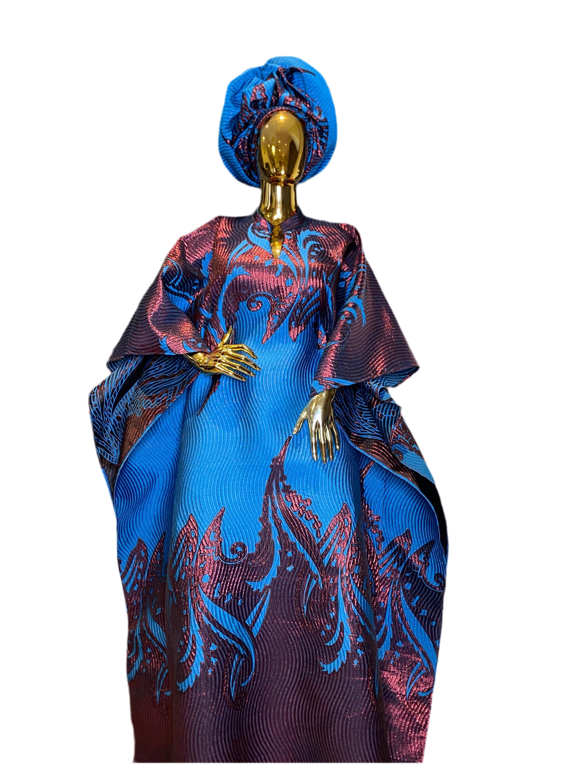 Luxury Blue Brocade Bubu Dress β 3-Piece African Kaftan with Head Wrap & Braided Hair Band, 62β Long, Inner Belt SaleLuxury Blue Brocade Bubu Dress β 3-Piece African Kaftan with Head Wrap & Braided Hair Band, 62β Long, Inner Belt