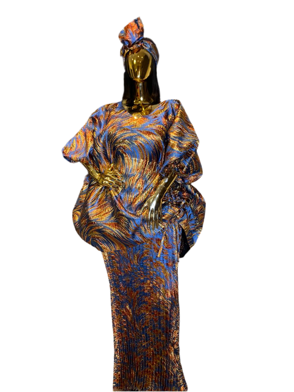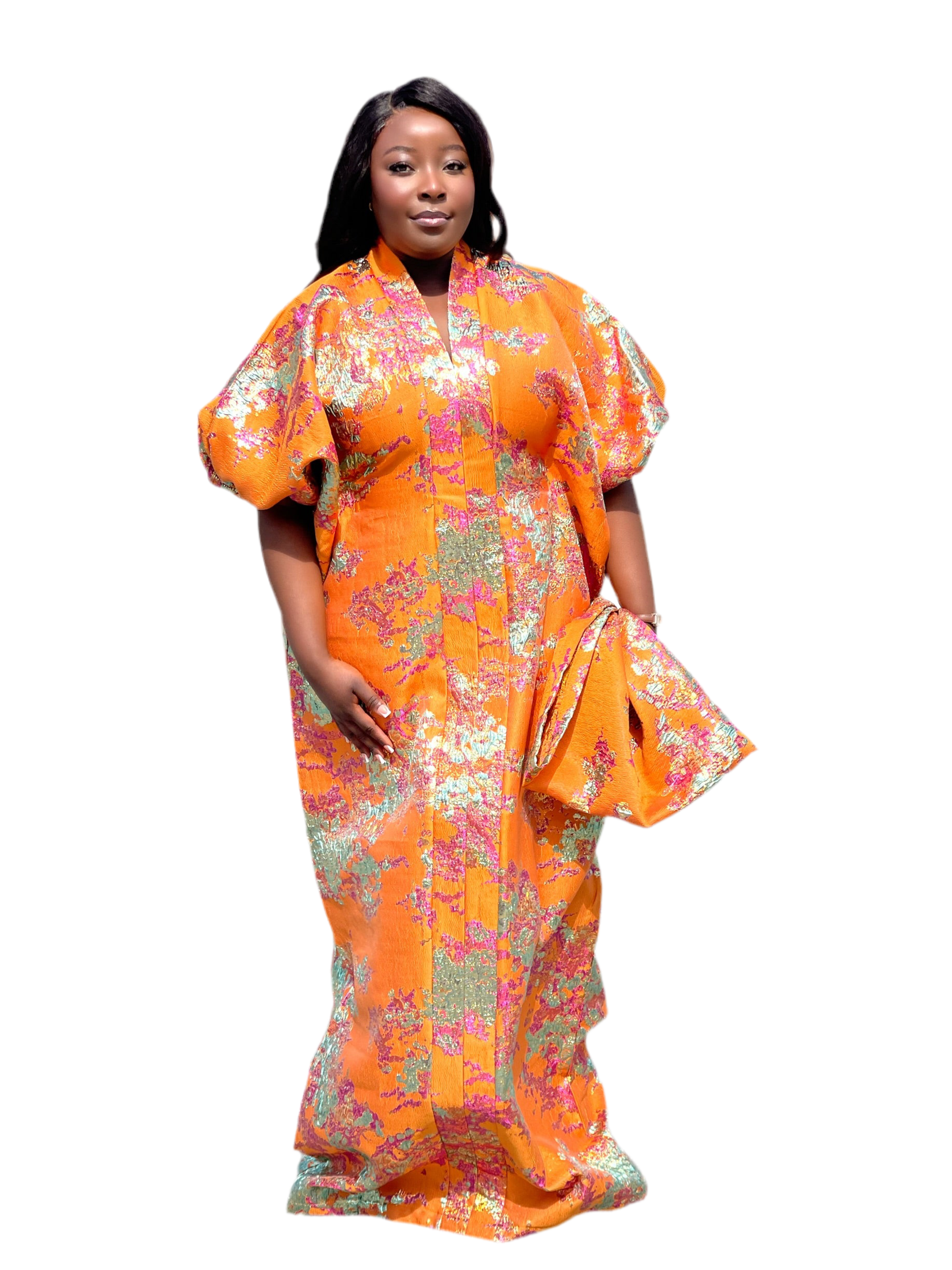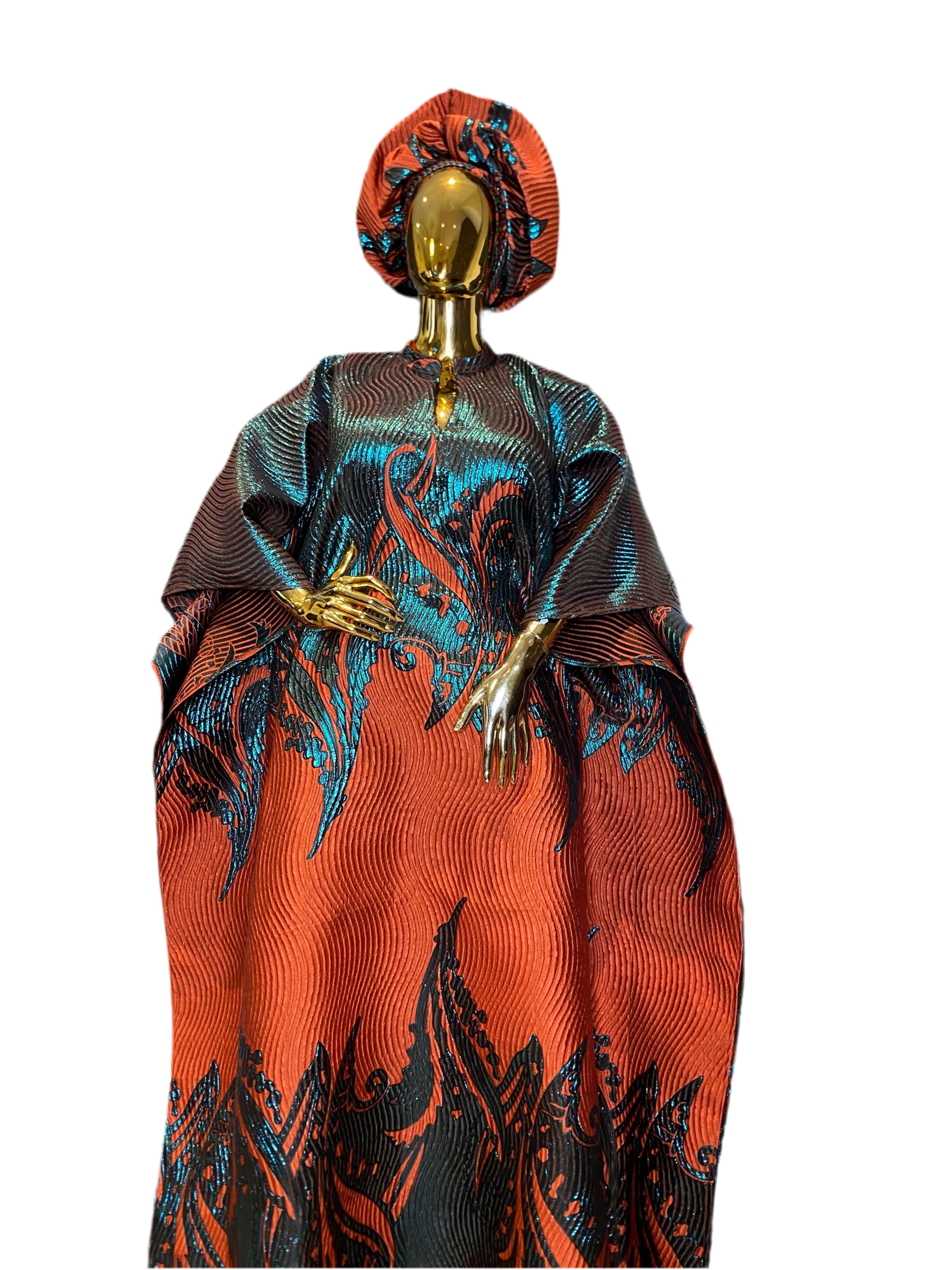 Regular price $145.00 Sale price $125.00Ombre Brocade Bubu Dress | 62β Long African Kaftan with Inner Belt, Head Scarf, & Side Slits